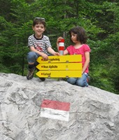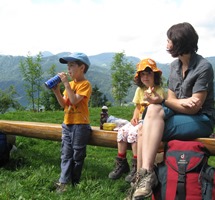 Diesen Monat haben wir etwas ganz besonderes gemacht: zusammen mit vielen Freunden unserer Eltern sind wir auf einen Berg gewandert und haben dort dann in einer Hütte übernachtet! Das war toll. Wir sind die ganze Strecke selbst gegangen - nur unsere Rucksäcke haben wir zwischendurch unserem Papa gegeben. Es war ein richtig tolles Abenteuer - wir mussten sogar ein Stück zu einem Bach gehen um Trinkwasser zu holen. Auf der Heimfahrt haben wir dann gesagt, dass wir unbedingt bald wieder in die Berge wollen.